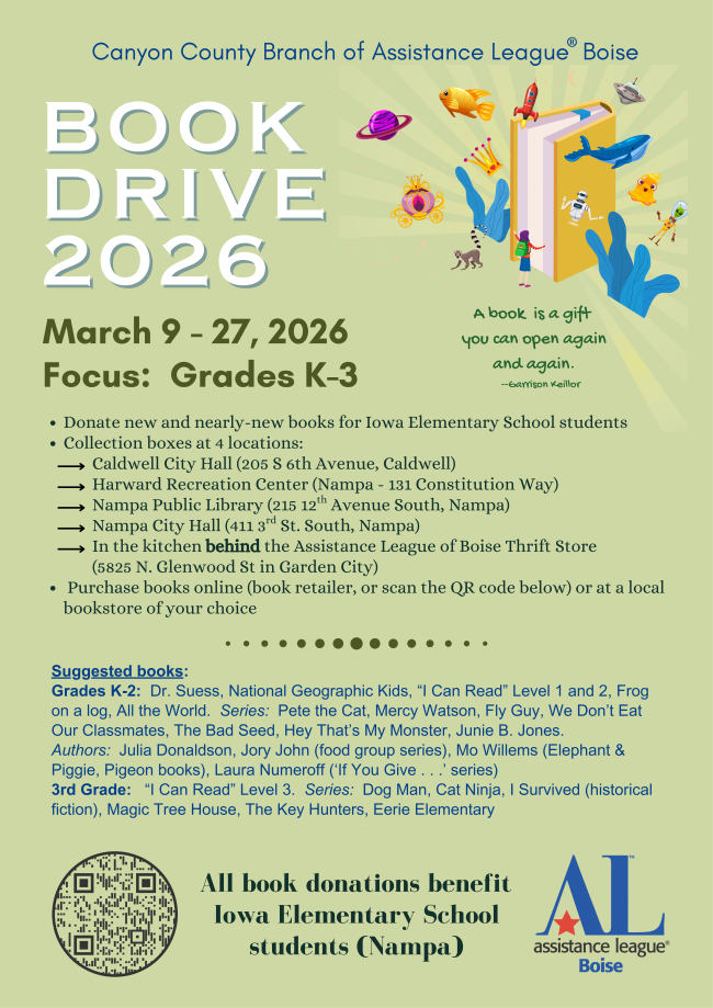 Support our Canyon Country Branch with their 2026 Book Drive from March 9th-27th. Donate new and nearly new books for Iowa Elementary School K-3 students! Click to view the full flyer with details on collection locations and suggested books.